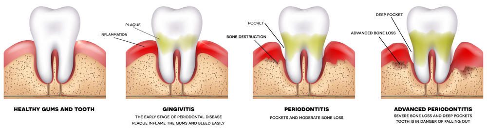 In simple cases, plaque makes the gums red, swollen and prone to bleeding. This is known as gingivitis. When neglected, gingivitis progresses into periodontitis as the plaque matures below the gum line. At this stage the bones, connective tissues and gums start to recede. This is a natural process where the body tries to remove contamination which results in teeth loosening and eventually falling out.