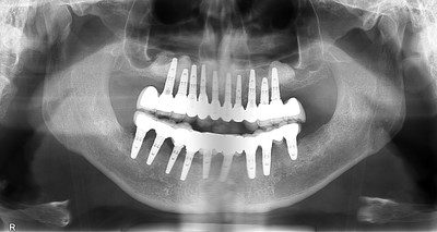 Implant treatment completed in the Phillipines. Twenty implants were placed; standard best practice for this type of case is to place only ten implants. At the time this x-ray was taken, one of the lower implants had failed and already been removed. All remaining implants subsequently failed and had to be removed here at Implant Solutions.